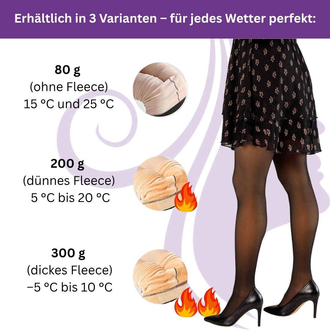 Entdecke den Unterschied: Vlies-Stoff in 80, 200 oder 300 Gramm sorgt für den individuellen Wärmekomfort in deinen Siluetta Strumpfhosen. Die leichte 200g-Variante bietet angenehme Wärme für milde Wintertage, während kräftigeres 300g-Vlies selbst bei Minus-Temperaturen zuverlässig schützt. So findest du immer die passende Stärke, ganz nach deinem Bedarf und Style.